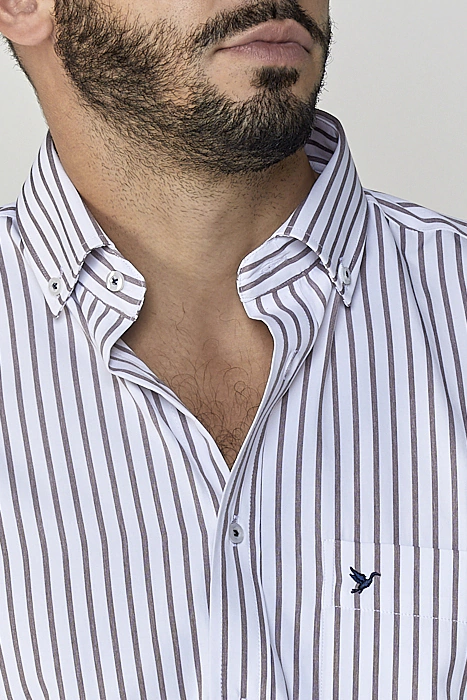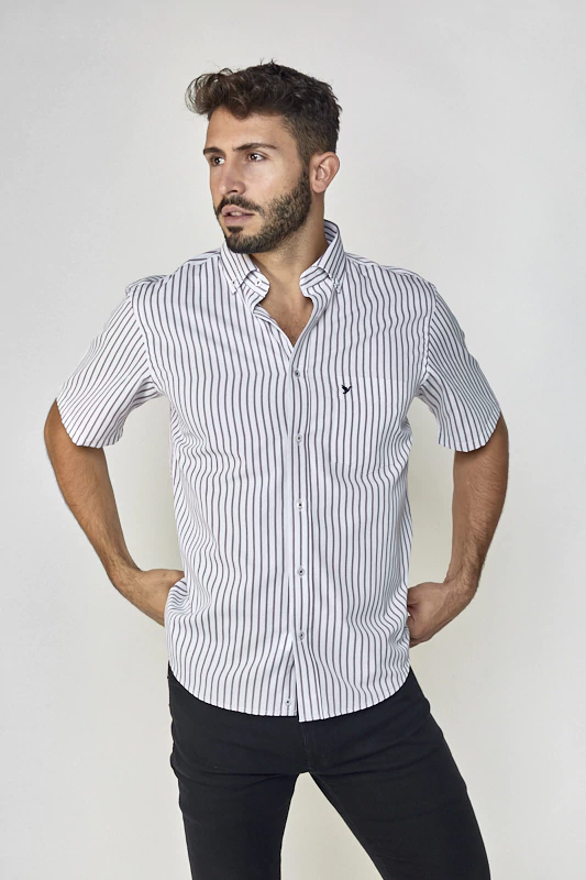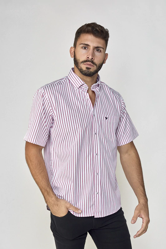 • Camisa Sport manga corta rayada con bolsillo y botón en cuello.