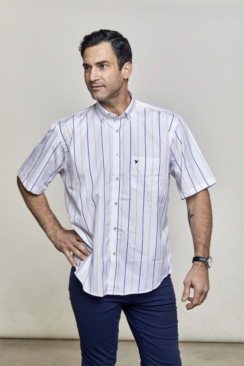 • Camisa Sport manga corta rayada con isologo de marca bordado en bolsillo, botón en cuello y pinzas en espalda para dar mayor amplitud.