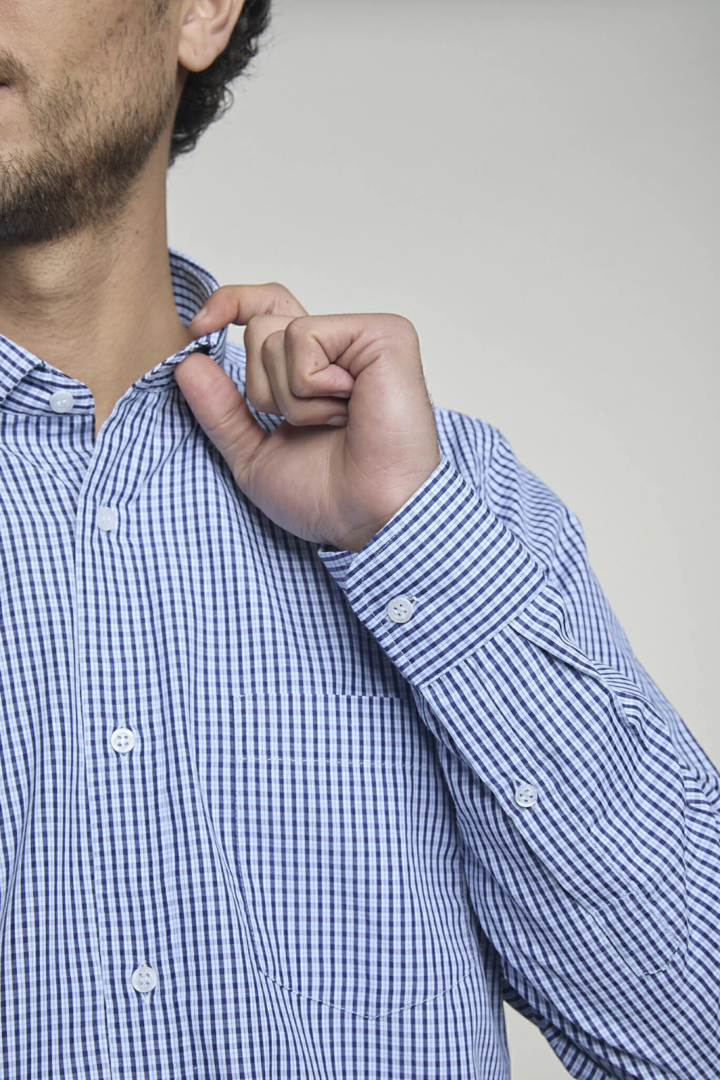 • Camisa sport manga larga a cuadros, con bolsillo, botón en cuello y dos pinzas en la espalda para mayor amplitud.