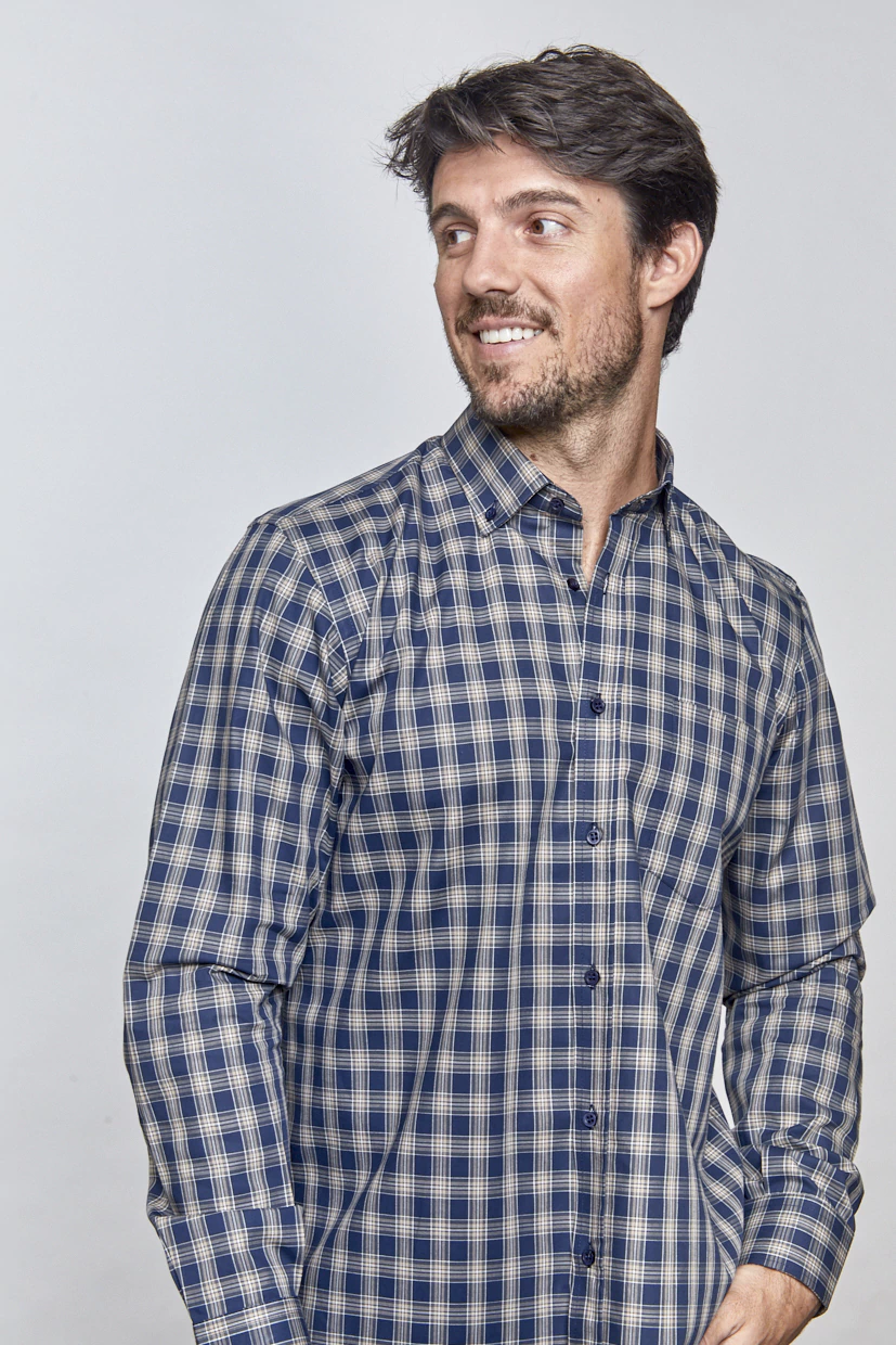 • Camisa sport manga larga a cuadros con bolsillo, botones en cuello y pinzas en la espalda para mayor amplitud.