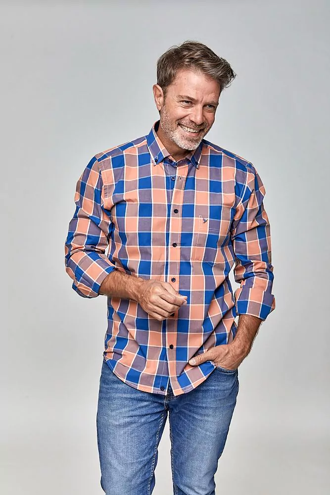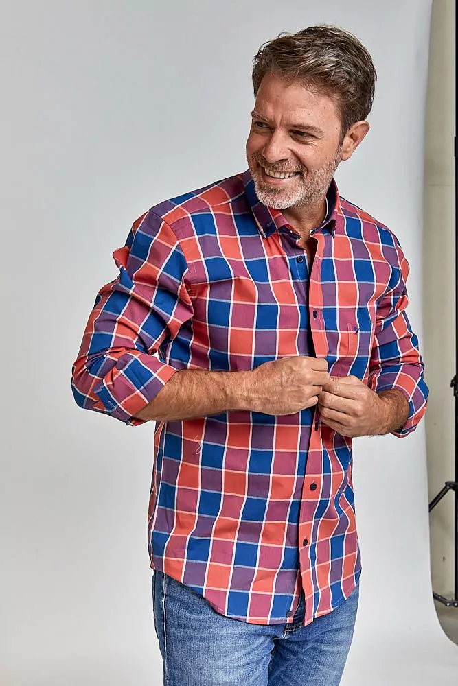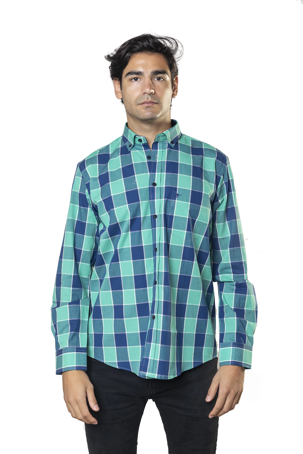 • Camisa Sport manga larga con bolsillo a cuadros con isologo bordado en el bolsillo y botón en cuello.