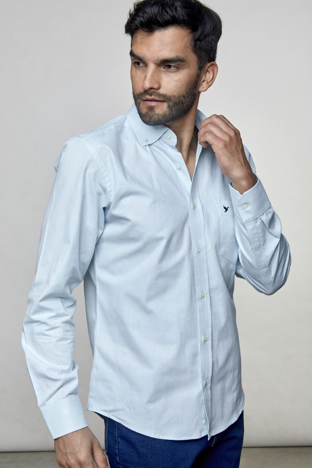 • Camisa sport manga larga lisa con bolsillo, botón en cuello y pinzas en la espalda para mayor amplitud.