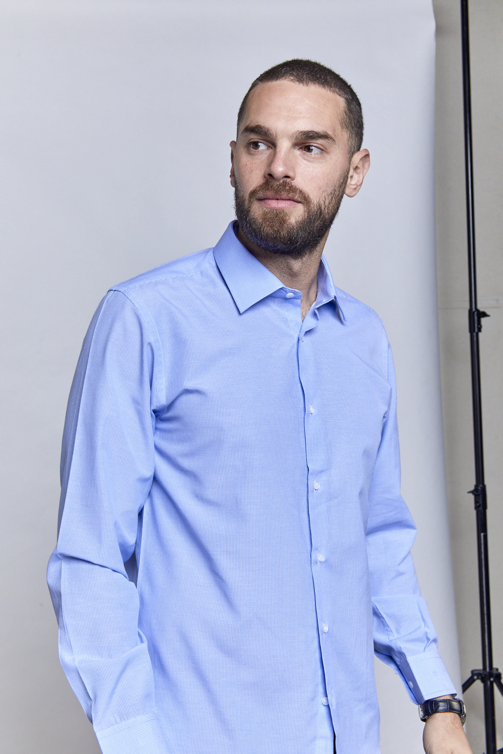 • Camisa de vestir rayada con doble botón en puños y pinzas en espalda para dar mayor amplitud.