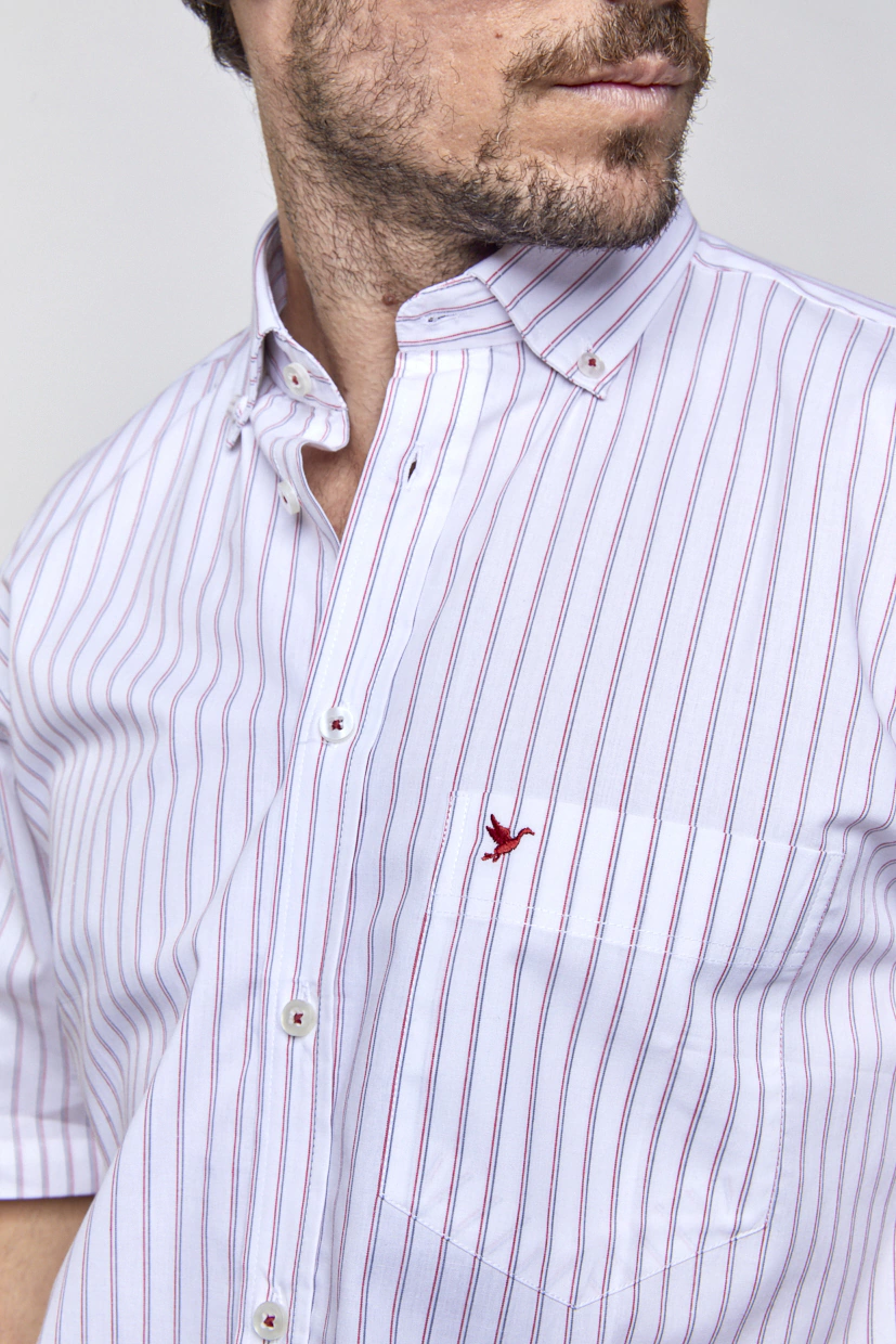 • Camisa sport manga corta rayada con bolsillo, botón en cuello y pinzas en la espalda para mayor amplitud.