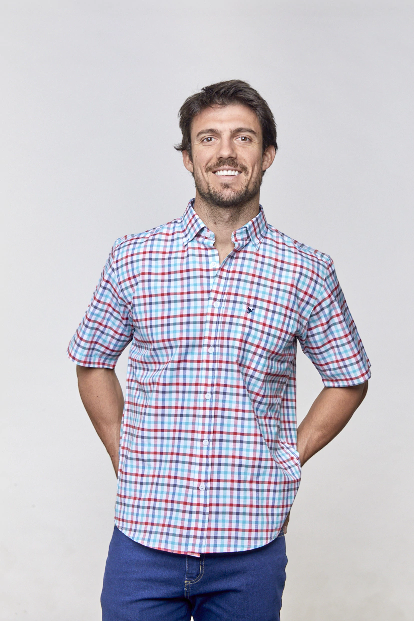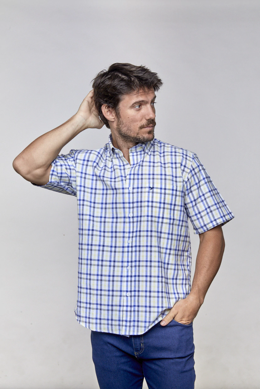 • Camisa sport manga corta a cuadros con bolsillo, botón en cuello y pinzas en la espalda para mayor amplitud.