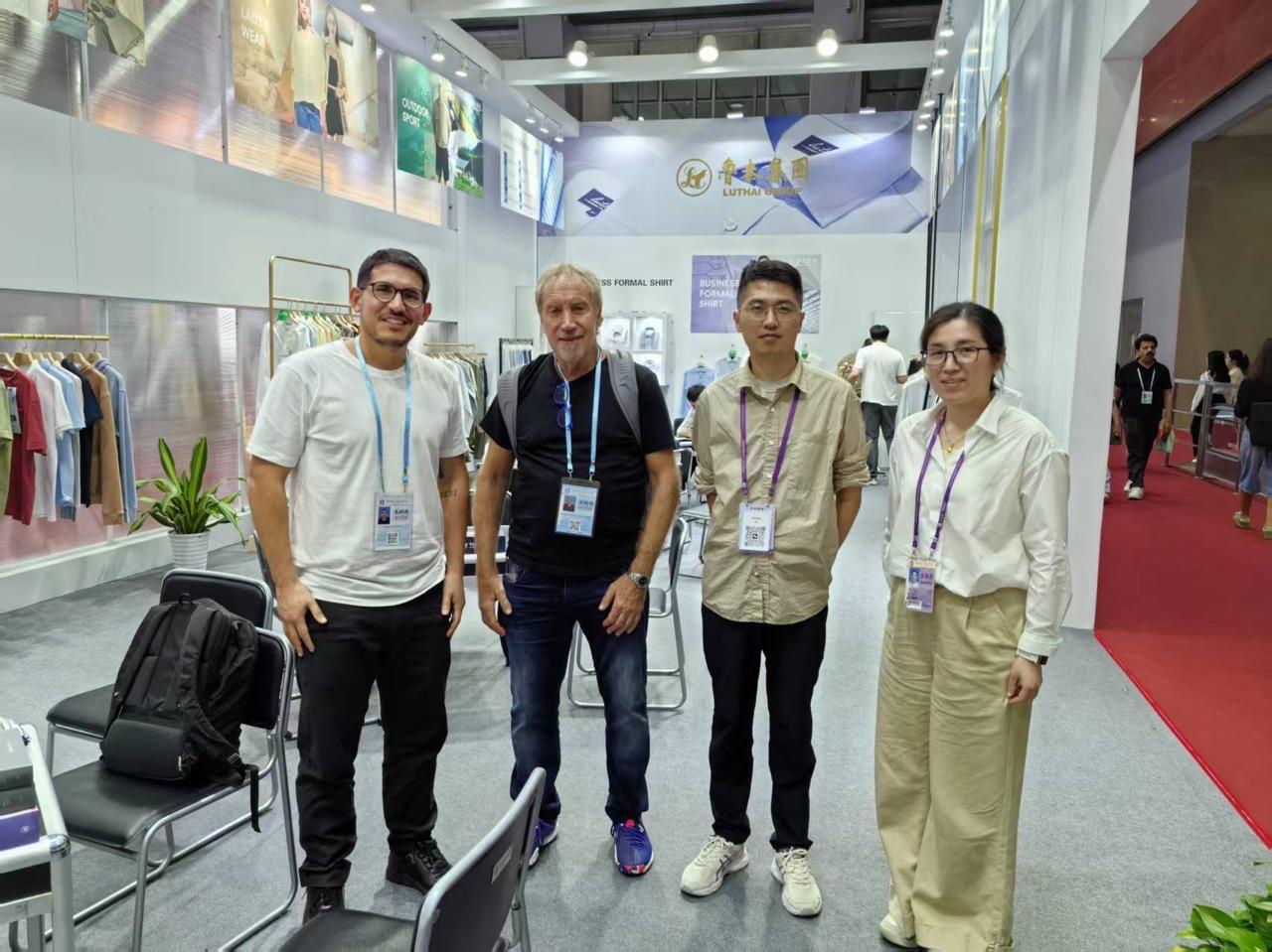 (Izq. a der. Tomás, Carlos y ejecutivos comerciales de una de las fábricas de tela mas importante del mundo, Luthai Textile Co. en la feria internacional de Cantón)